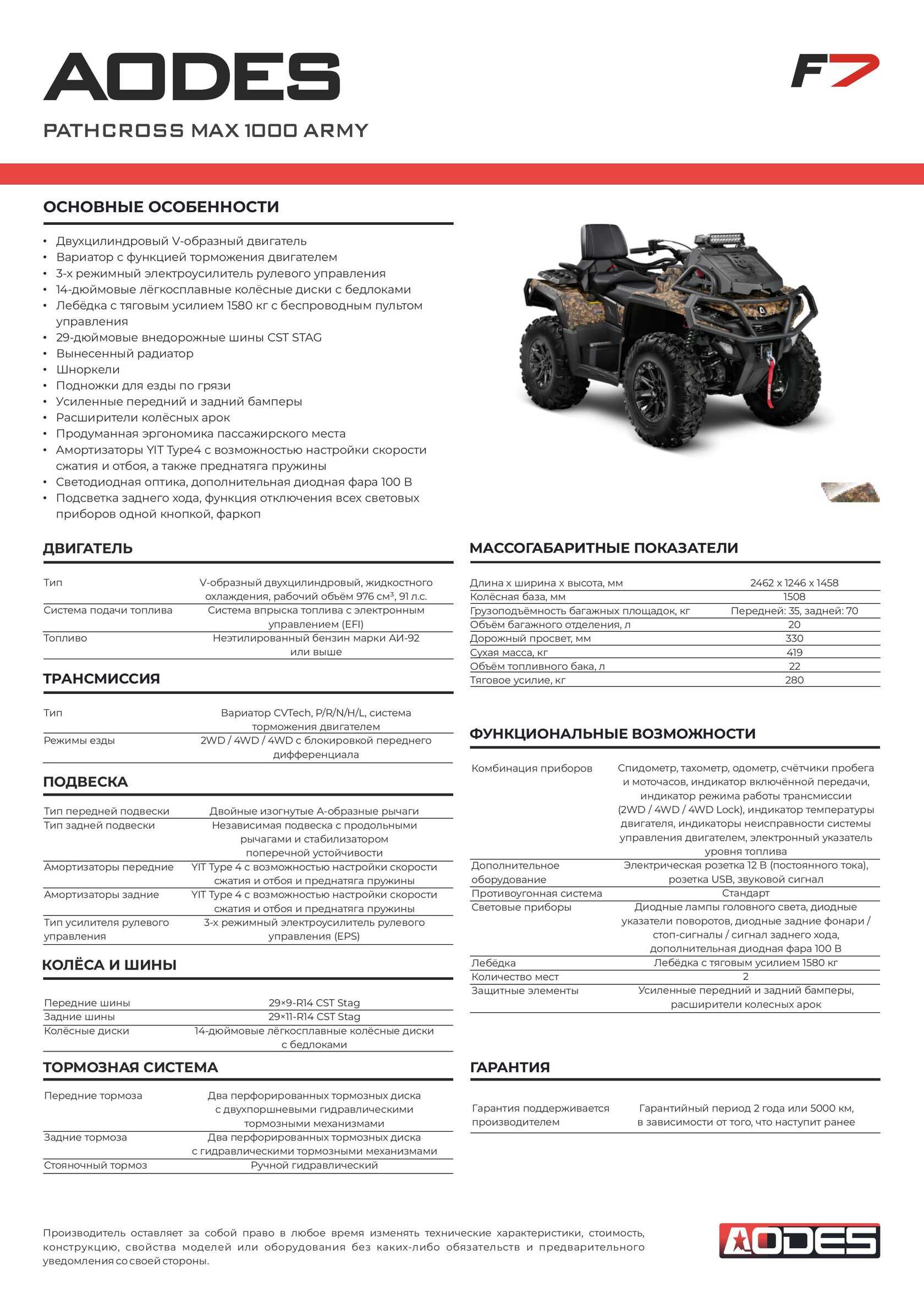 Квадроцикл для езды по грязи, лужам и глубокой колее — идеален для активной езды, туризма и трофи-рейдов. За счет усилителя руля отлично управляется, а благодаря длинной колесной базе сохраняет устойчивость даже при резких поворотах на скорости.У модели богатая комплектация: с лебедкой, бамперами, защитой рук и регулируемыми амортизаторами. Также есть модульное пассажирское сиденье с удобной спинкой и ручками.Версия Army отличается клиренсом 33 см и 29-дюймовыми внедорожными покрышками. Также здесь установлен дополнительный свет и регулируемые амортизаторы YIT Type 4. Еще модель получила камуфляжную расцветку и кнопку для быстрого отключения света.